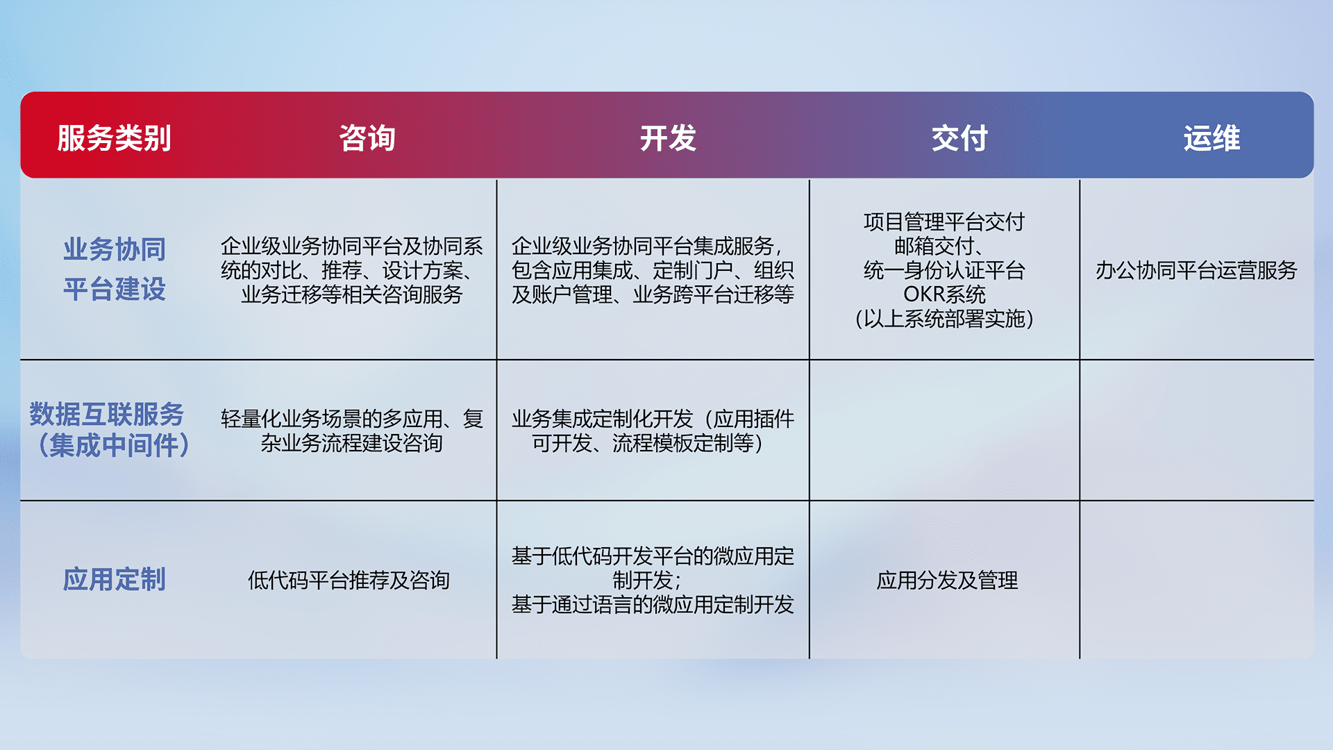 针对钉钉、、企微、、IDaas等平台级产品提供产品的规划、、方案、、交付、、、定制化开发等服务,,,实现如统一协同办公、、、智能客户服务、、、、混合会议管理、、、智能数据查询、、、等业务场景,,实现数字化转型。。。