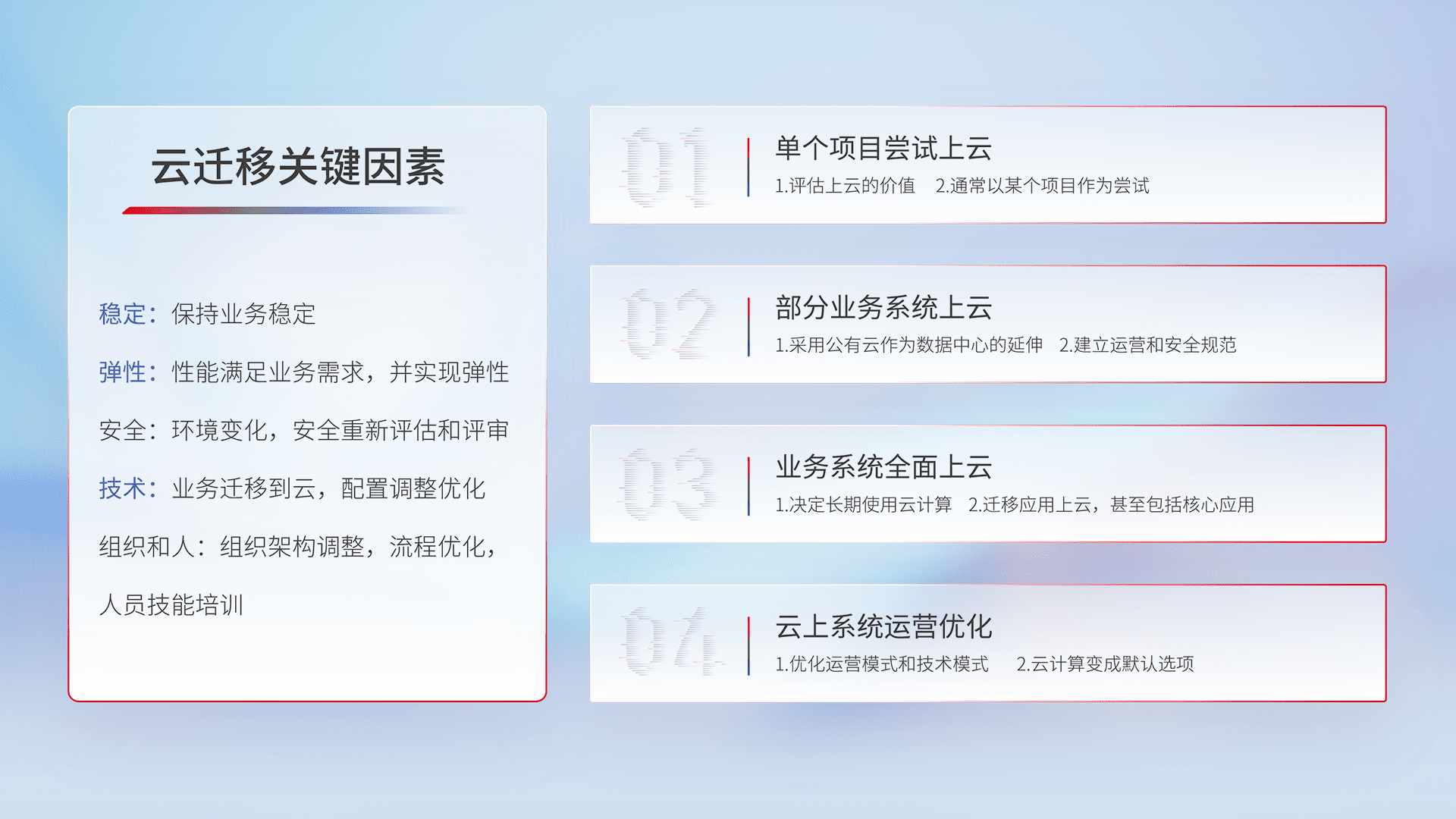 结合实际业务,,,,从规划设计、、、云平台选型、、、、云原生改造、、、数据迁移、、、、集成交付,,,迁移全过程为客户识别最佳上云路径,,做好风险识别管理,,,,设计网络架构、、、身份权限、、、安全审计合规、、、操作审计、、日志审计、、、、监控告警策略、、多站点容灾设计等,,,,对云上基础设施进行整体规划,,,,提升IT治理水平,,,,以满足弹性、、、高可用、、、、高性能的需求。。