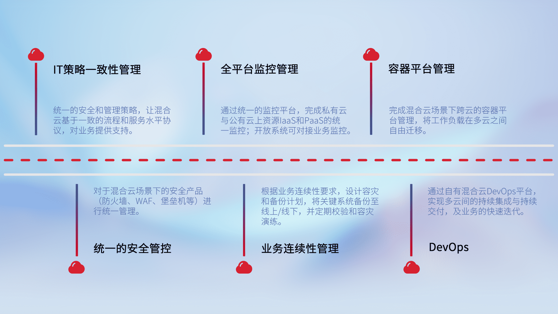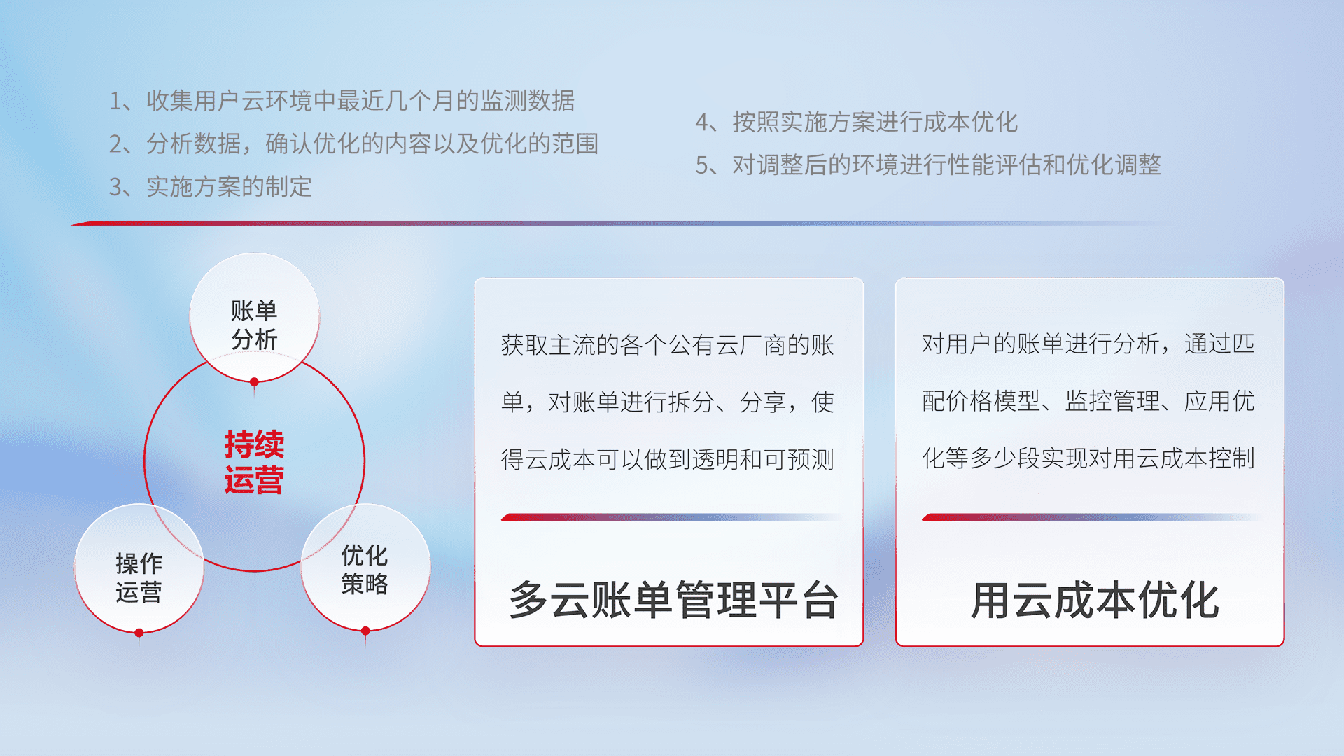 通过多云纳管,,,以统一的资源数据模型把客户的云资源进行抽象和封装,,进而实现对多云资源的统一操作,,,保障云资源管理的可靠性、、、稳定性与可用性。。量身定制化运维内容,,,配置、、、开发运维、、、补丁管理、、、备份、、、监控、、、认证和访问管理、、、审计和日常巡检等,,保障在用云过程中的可靠度,,,,稳定度以及高可用率。。