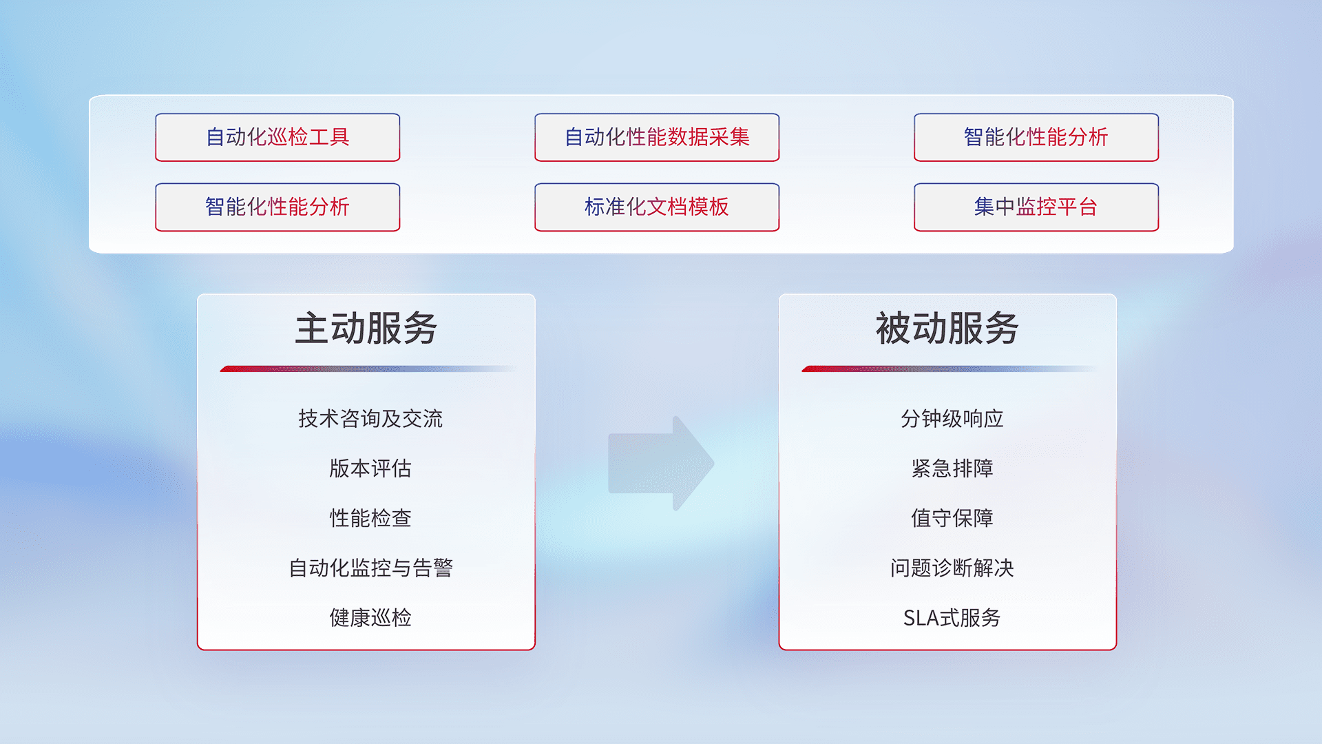 智能化工具和标准化文档,,保障服务质量,,,提供主动服务(包含技术咨询、、版本评估、、、、性能检查、、、、自动化监控与告警、、、健康巡检)和被动服务包含(分钟级响应、、紧急排障、、、值守保障、、问题诊断解决、、、SLA服务)。。。